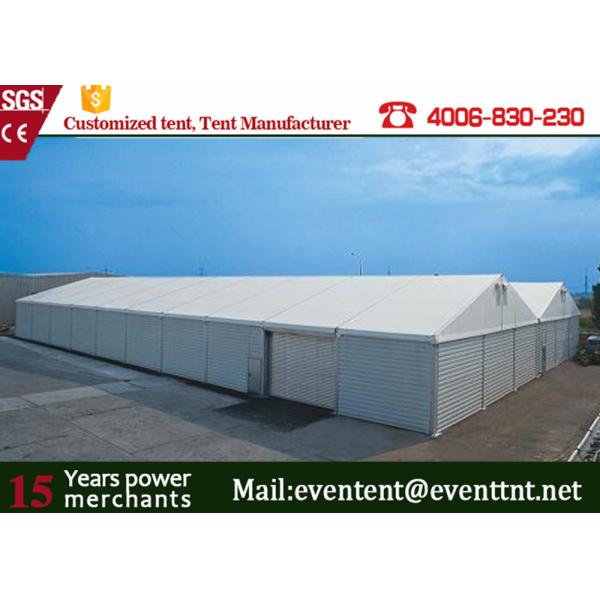 1. Fabric cover: 850g/sqm block-out white PVC for roof , 650g / sqm translucent white PVC for side walls , PVC coated polyster fabric , color optional . 100 % waterproof , fire retardant ( DIN4102 B1 , M2) , CFM , UV resistant , tear resistant , self - cleaning ability . Besides PVC coated polyster fabric , the fabric cover can be transparent PVC , TPU or mixed together to make the outdoor warehouse tents in different design and styles .